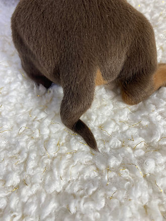 1. Female Chocolate and Tan Smooth Coat. (Smallest in the litter. Has white on the tips of her rear paws and a tiny white spot on her chest). She also has a corkscrew tail. Her tail is not straight. $2300. AVAILABLE